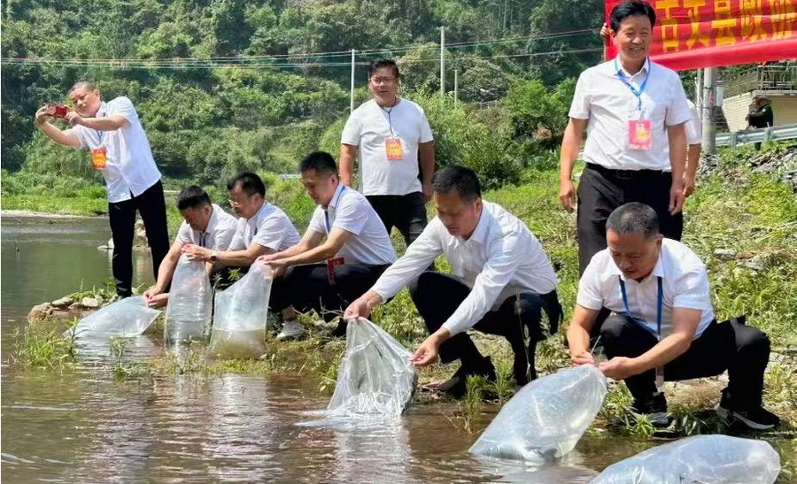書香潤初心,助力生態(tài)美。5月29日,古丈縣政協(xié)“書香伴履職·學(xué)習(xí)聚共識”讀書分享會暨“改善生態(tài)環(huán)境民主監(jiān)督”活動在巖頭寨鎮(zhèn)舉行。海利駐村工作隊全程參加了本次活動。在鲇溪村,縣政協(xié)主席宋祖林及委員代表一行實地走訪了河流沿岸、垃圾處理場等重點區(qū)域,現(xiàn)場調(diào)研生態(tài)環(huán)境保護現(xiàn)狀,聽取干群意見,并就發(fā)現(xiàn)問題提出整改建議。活動組還向鲇溪河投放魚苗20萬尾,以促進水域生態(tài)修復(fù)。